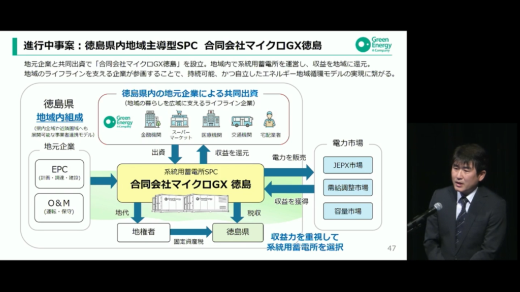創業以来全国で5,000件を超えるグリーンエネルギー施設の開発実績を背景に、系統用蓄電池事業の全国展開について説明するとともに、地域企業や個人がエネルギー事業に参画し収益を地域に還元する「マイクロGX徳島」の取り組みを事例として、GXを地域から実装する具体的な方法と今後の構想を共有しました。